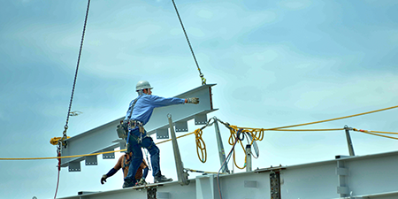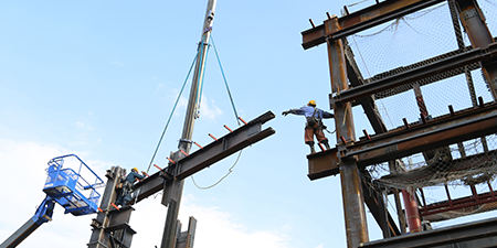 高層ビルなどで、タワークレーンを使い、人間でいうと骨組みになる鉄骨を吊り上げ、組み立てていきます。当然安全に十分配慮した形ですが、高所での作業を行います。「鉄骨建方」と呼びます。